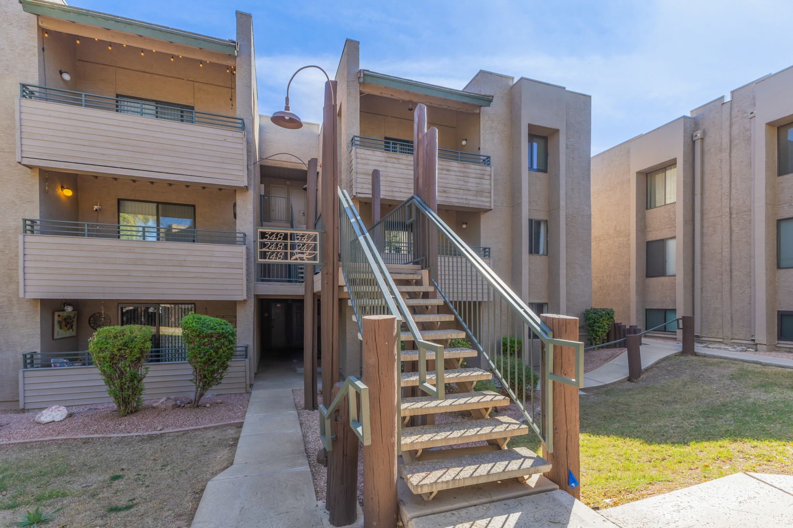 Prime top-floor condo in the vibrant heart of Old Town Scottsdale. This spacious two-bedroom residence features updated bathrooms, new paint, ceiling fans and a brand-new washer/dryer for added convenience. The kitchen boasts stainless steel appliances and granite countertops, complemented by a wet bar. Enjoy abundant natural light throughout, along with a private balcony offering great views and outdoor relaxation. Ideally situated in Old Town Scottsdale, convenient to an array of shopping, dining, entertainment options, and nearby spring training facilities.