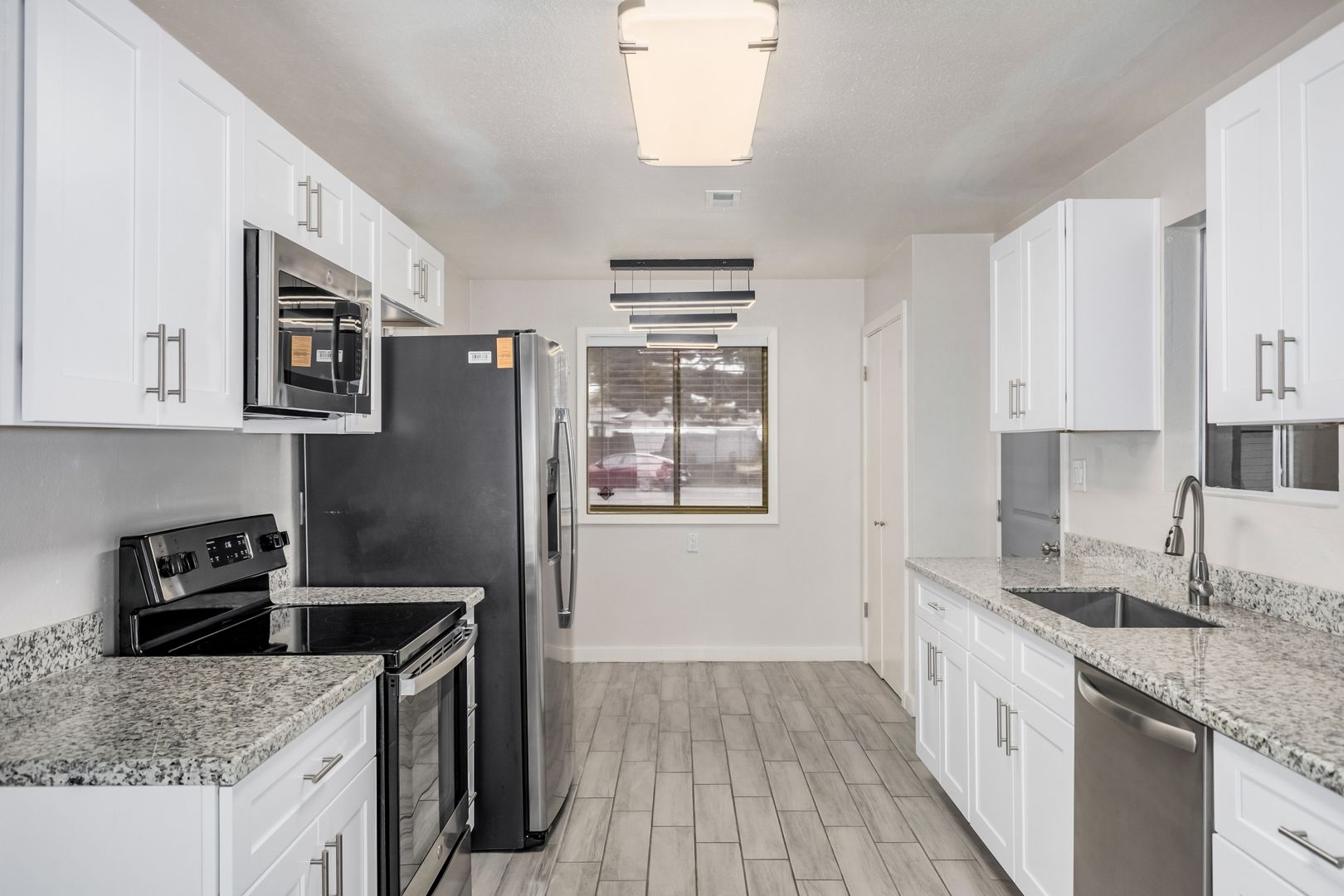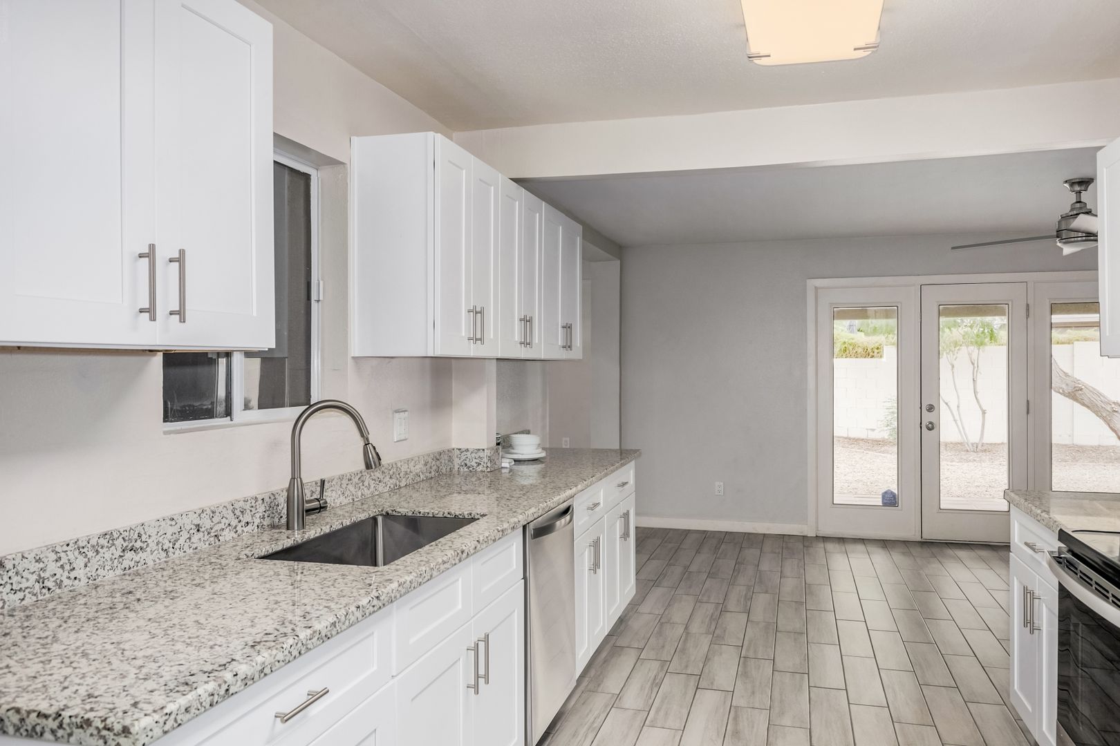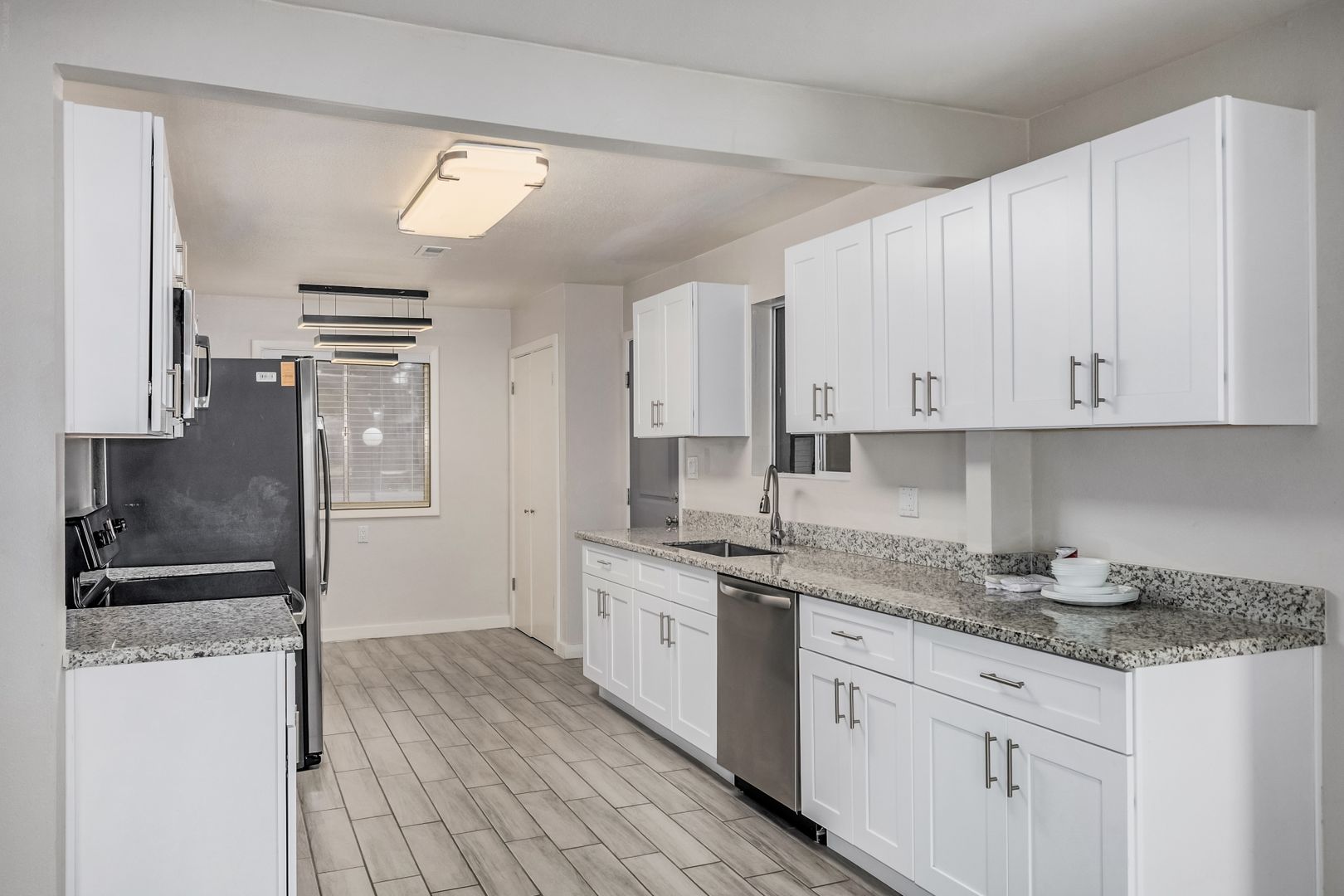 Welcome to this beautifully updated home in Cavalier Estates! This move-in ready home features 3 bedrooms, 2 bathrooms, 1,680 square feet, 2 car garage a bright, open-concept floor plan with modern finishes throughout. The spacious living area showcases wood-look tile flooring, neutral tones, and a contemporary ceiling fan, creating a clean and inviting atmosphere. The fully remodeled kitchen is a standout, complete with sleek white shaker cabinets, granite countertops, stainless steel appliances, and ample storage—perfect for both everyday living and entertaining. Enjoy a stylishly upgraded bathrooms featuring designer tile work, a modern vanity, and updated fixtures that add a touch of elegance. The home also includes updated lighting, fresh interior finishes, and a functional layout designed for comfort and convenience.