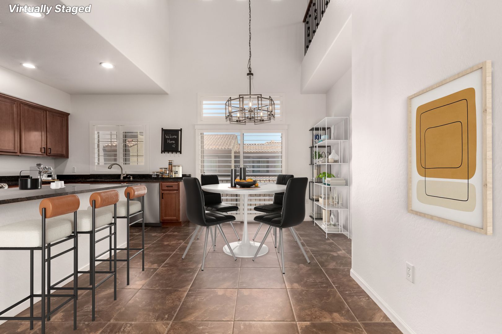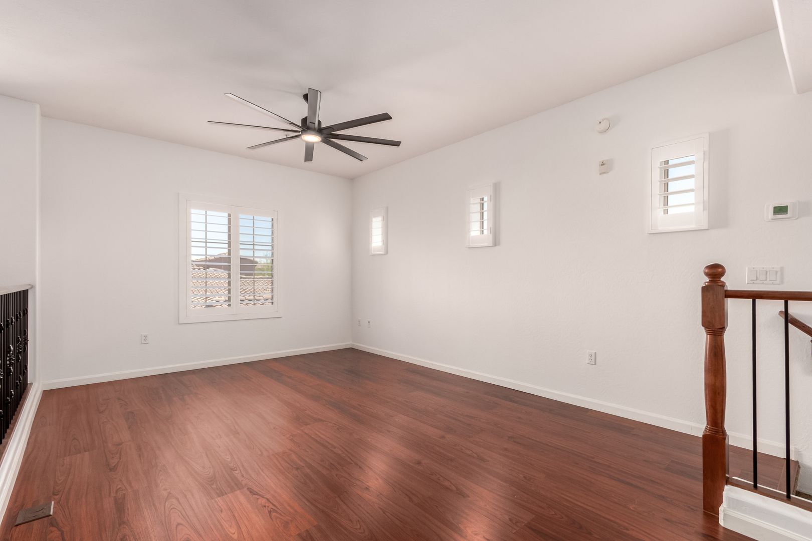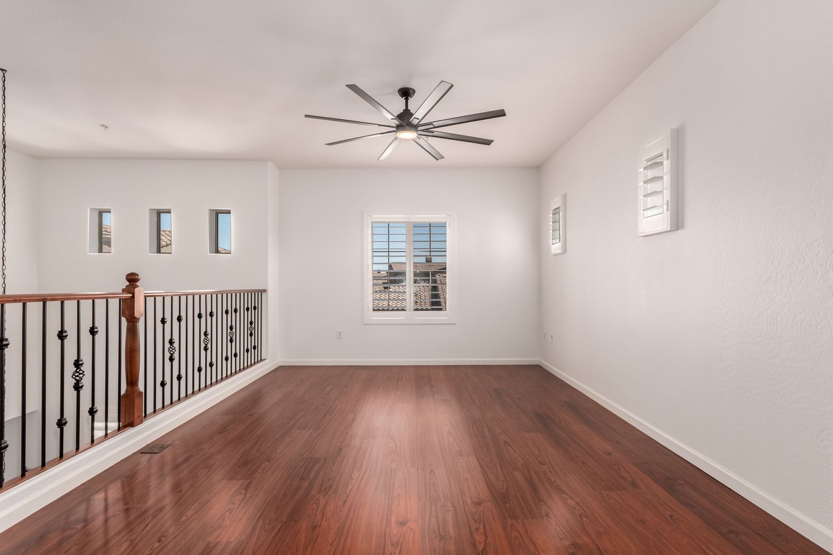 MODERN! STUNNING! This 2-bedrooms, 2-bathrooms + a Den, offers modern living in a vibrant resort style community. Featuring an open floor plan, plantation shutters & brand new paint. Home exudes warmth and style. The spacious kitchen boasts granite countertops, upgraded stainless steel appliances, open floor plan & large island. The main suite includes a covered deck with lush landscaping for morning coffee, walk-in closet, en-suite bath with dual sinks, soaking tub, & shower. A 3rd-level loft is perfect for a home office or game room. 2-car garage, & easy access to the community pool, spa, and sports courts. Located near the sought-after Aviano Community Center & top-rated school with shopping, dining & entertainment just minutes away. Don't miss this opportunity!