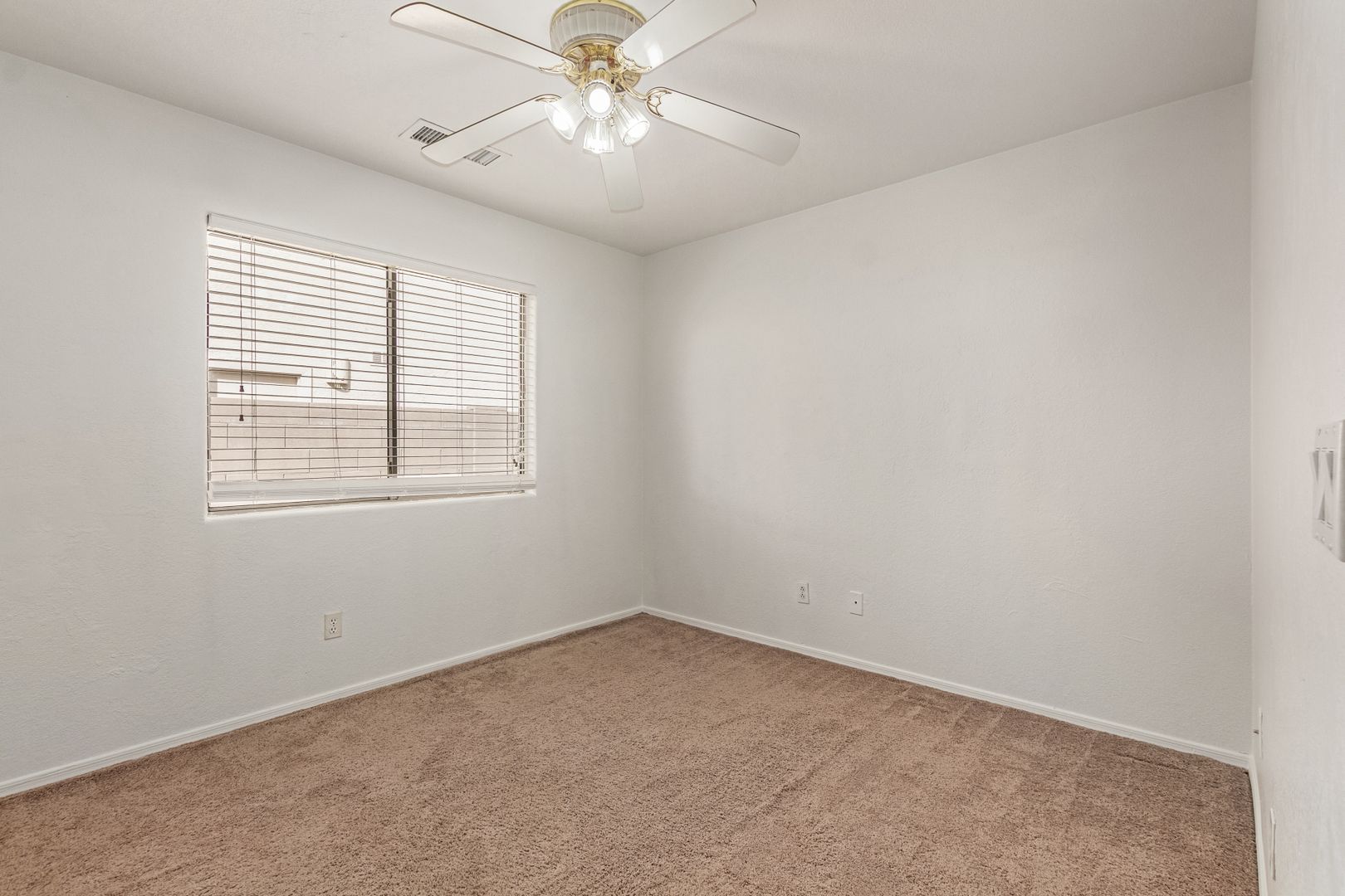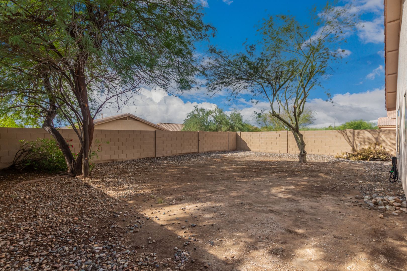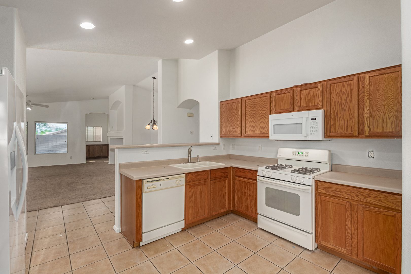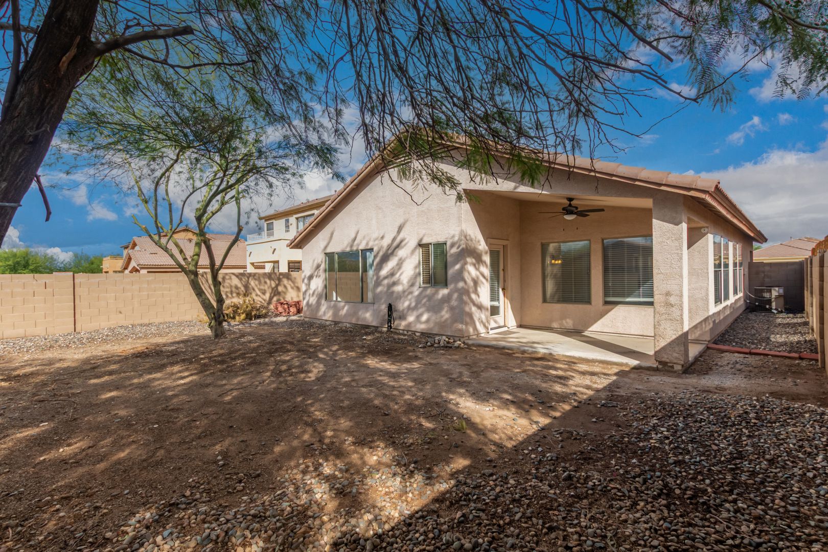 Beautiful 3-bed, 2-bath home in desirable Estrella Mountain Ranch! Enjoy a bright great room with vaulted ceilings and a custom media center, plus an eat-in kitchen with oak cabinets, breakfast bar, and gas cooking. The primary suite offers a walk-in closet and a bath with separate tub and shower. Low-maintenance landscaping and a covered patio make outdoor living easy. Community amenities include pools, spas, tennis, clubhouse, golf, lakes, and scenic walking paths. A wonderful home in a resort-style community!
