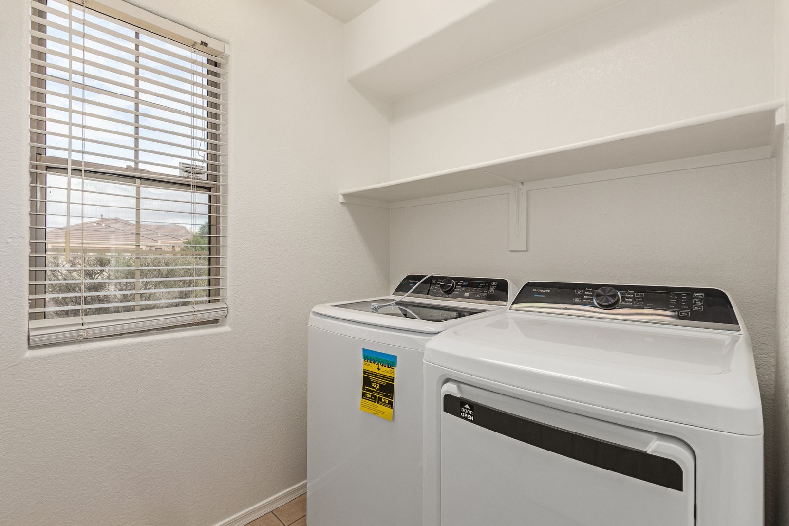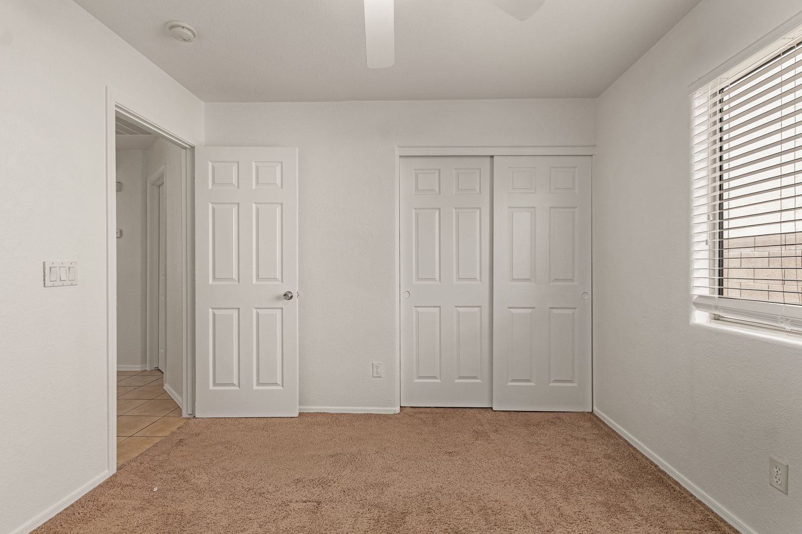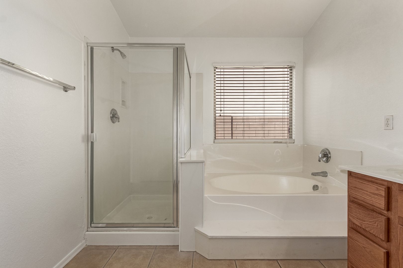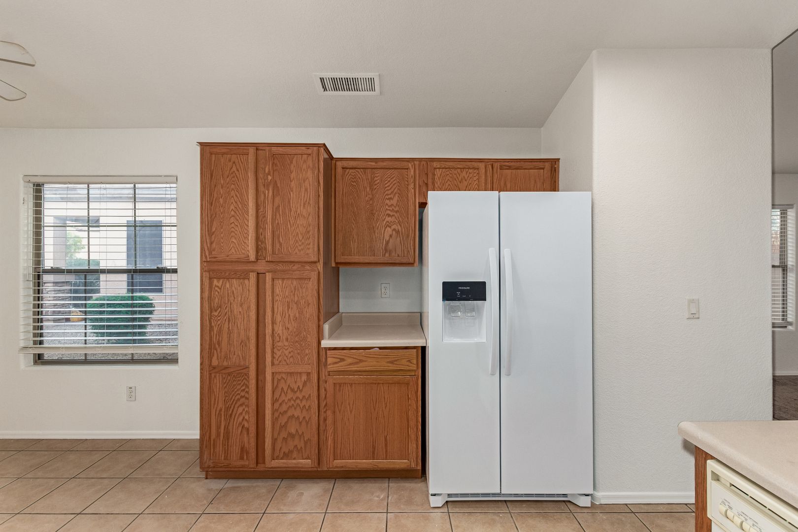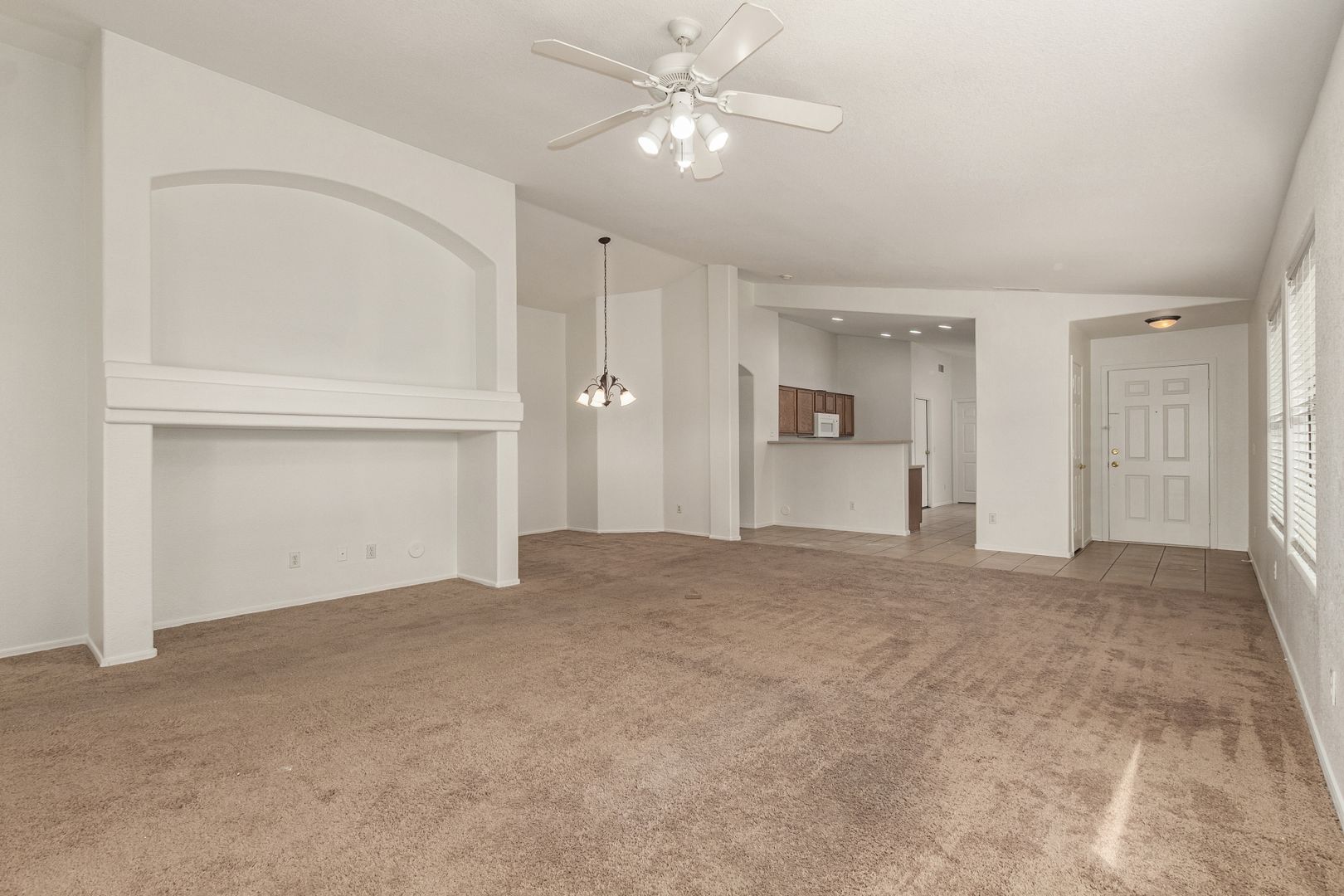 Beautiful 3-bed, 2-bath home in desirable Estrella Mountain Ranch! Enjoy a bright great room with vaulted ceilings and a custom media center, plus an eat-in kitchen with oak cabinets, breakfast bar, and gas cooking. The primary suite offers a walk-in closet and a bath with separate tub and shower. Low-maintenance landscaping and a covered patio make outdoor living easy. Community amenities include pools, spas, tennis, clubhouse, golf, lakes, and scenic walking paths. A wonderful home in a resort-style community!